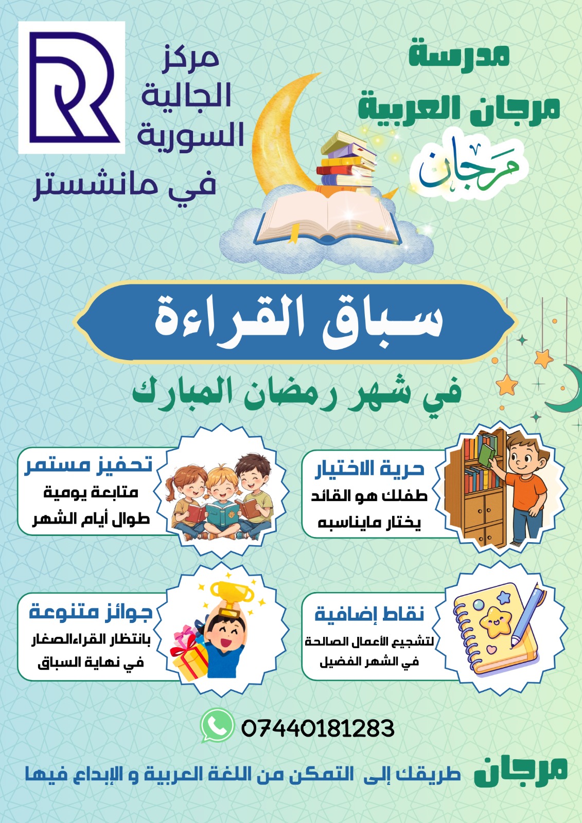 أعلنت مبادرة مرجان لتعزيز اللغة العربية عن "سباق القراءة في رمضان" وهو مسابقة لتشجيع الأطفال واليافعين على القراءة باللغة العربية. وقد جاءت المسابقة على نسختين متشابهتين: نسخة خاصة بمنطقة مانشستر ونسخة دولية للمقيمين في أوربا وبريطانيا عموماً.